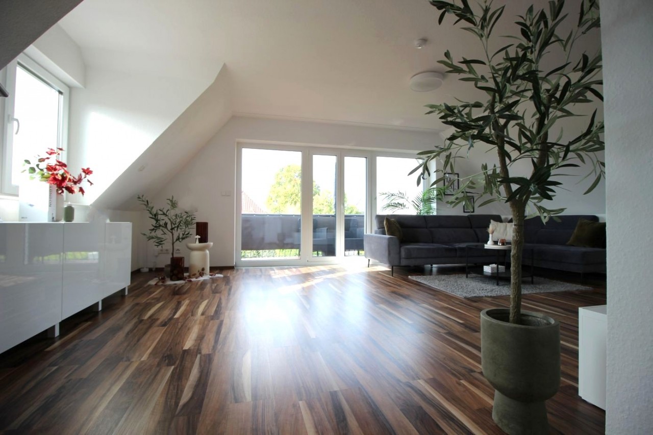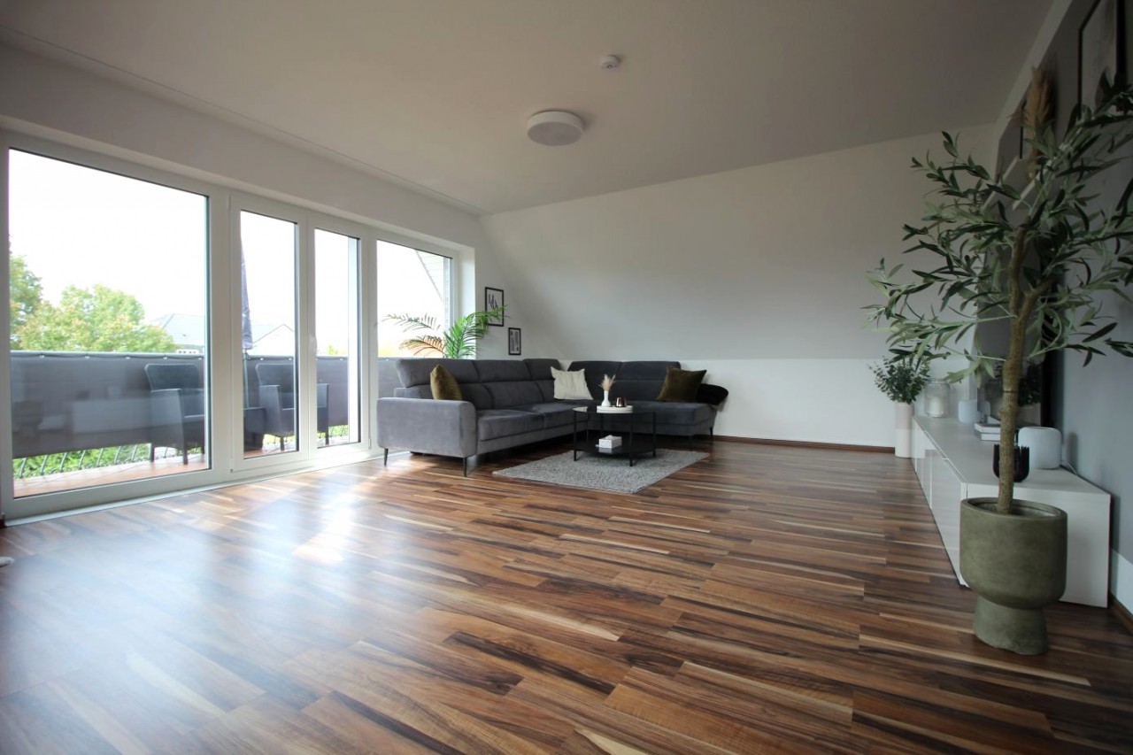 Auf etwa 92 m² Wohnfläche finden Sie ein helles und einladendes Wohnzimmer,