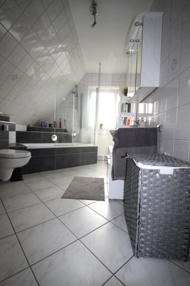Das moderne Bad überzeugt mit einer Badewanne und einem separatem Gäste-WC, ergänzt